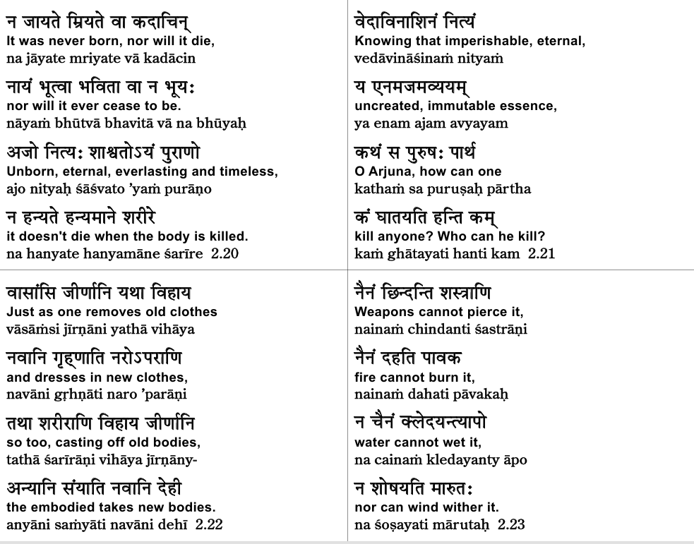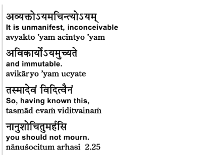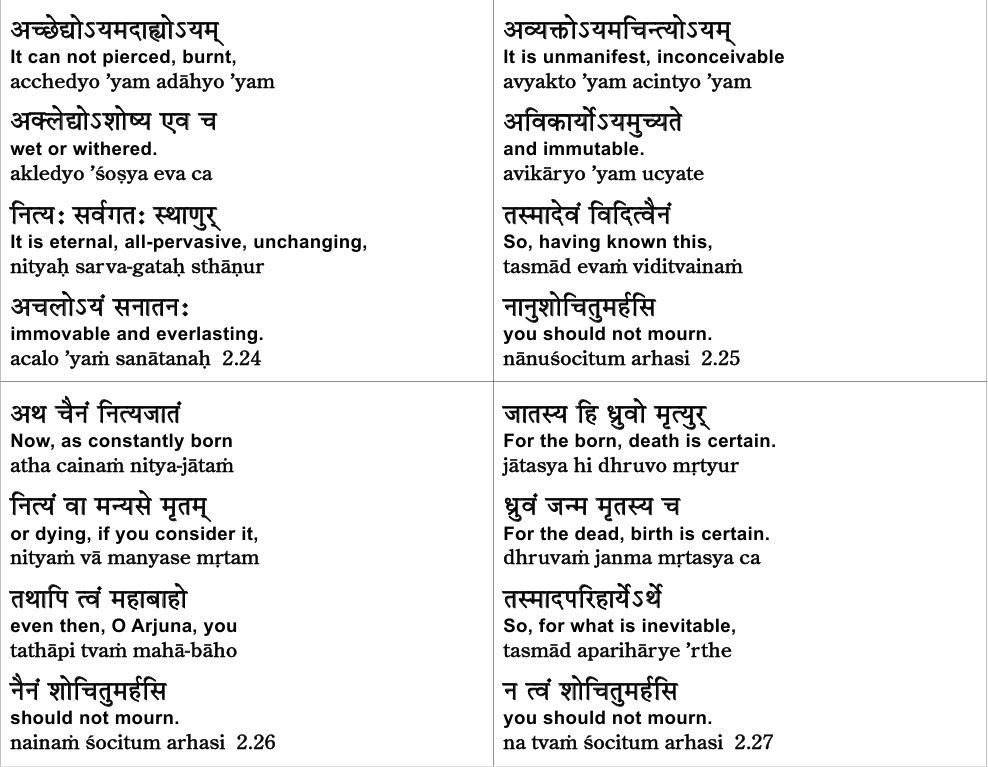 So now we’re going to shift with this 26th verse. We shift our perspective from atma to sūkṣma śarīra. Previously, Sri Krishna says, nothing happens to atma, therefore you need not grieve. Now, Sri Krishna is going to say, nothing happens to sūkṣma śarīra either. Therefore, you need not grieve.