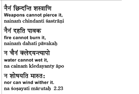 You might have noticed that we have four of the five fundamental elements here. Beginning with earth—shastra, weapons, are made of the element earth. So first you’ll see element earth cannot affect atma, then comes pavakaha—fire, agni—agni cannot affect the element, cannot affect atma. Then comes the element apaha—water—cannot affect atma, and finally maruta—wind, vayu, more commonly called—vayu cannot affect atma.