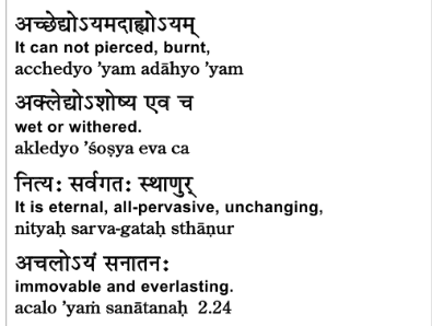 So restating what was said in the prior verse. Now there’s an important question we can ask here—why, based on what, can Arjuna claim that atma is unaffected by these four elements? And he gives the reason—Sri Krishna gives reason in the second half of the subverse.