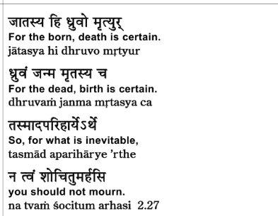 So, to paraphrase the first two lines: death is certain for anyone born, and birth is certain for anyone who dies. According to the doctrine of karma, the sukshma sharira, its integrity is maintained. It is driven on by the laws of karma—the winds of karma, we’ll call them—drives that sukshma sharira on.