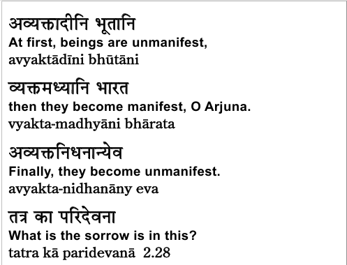 Avyakta nidhanāni—those who in the end become unmanifest again. After the body dies, and after the sukshma sharīra detaches itself from the body, it travels on—once again unmanifest.