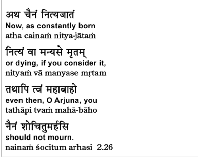 So, Sri Krishna says, from the standpoint—just to summarize—verse 26, from the standpoint of sukshma sharira also—prior verses are from the standpoint of atma, but in verse 26, Sri Krishna shifts to the perspective of the subtle body. From the perspective of the subtle body also, Arjuna, you need not grieve.