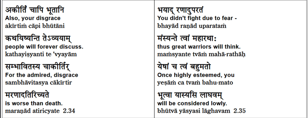 And reason number 3, which we’re discussing now—and that is that it is Arjuna’s duty and responsibility to fight. It is his Dharma. If he fulfills Dharma, he will be praised by everyone. And if he fails to perform his Dharma, he’ll be heavily criticized. We just saw that topic.