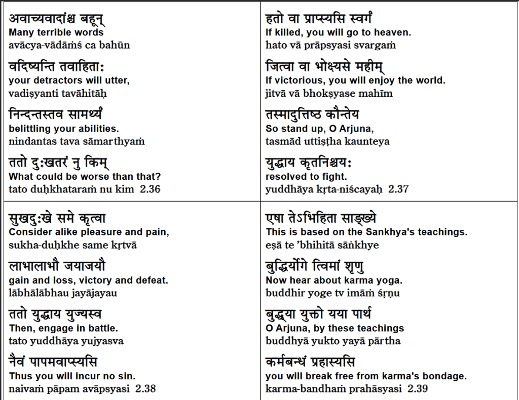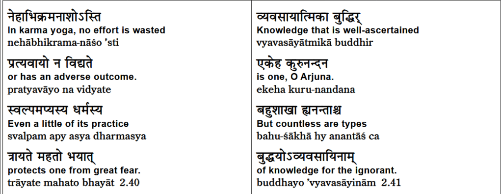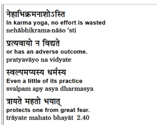 Good. Welcome to our weekly class on Bhagavad Gita. We continue today in chapter two. We’ll begin, as always, with some recitation. Be sure to glance at the meaning while I’m reciting, then repeat after me.