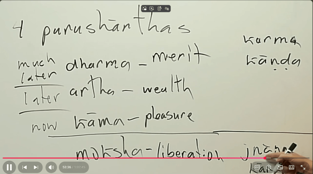And let me show you on the board. When we speak of goals of life in the Hindu tradition—you may have seen this teaching before—it’s common to refer to—when we talk about goals of life—it’s common to refer to four…
