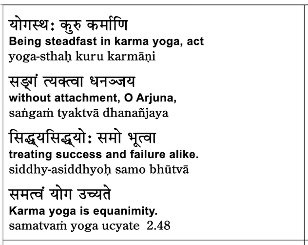 Okay, let us return to where we left off. In the prior class we saw the most arguably the most important verse with regard to Karma Yoga. The verse at every one quote, Same is often translated,