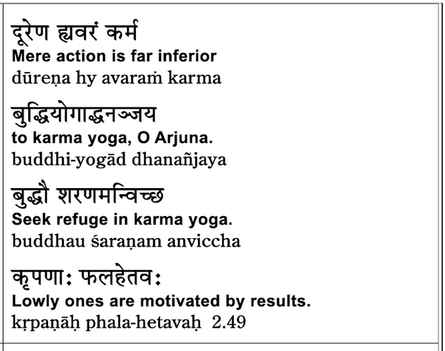 In comparison to buddhi yoga — we saw that term before — do you remember? Buddhi here means the attitude of karma yoga. So yes — karma yoga. Buddhi yoga means karma yoga in this context. It can have other meanings elsewhere, but here buddhi yoga, we saw the term before, means karma yoga.
