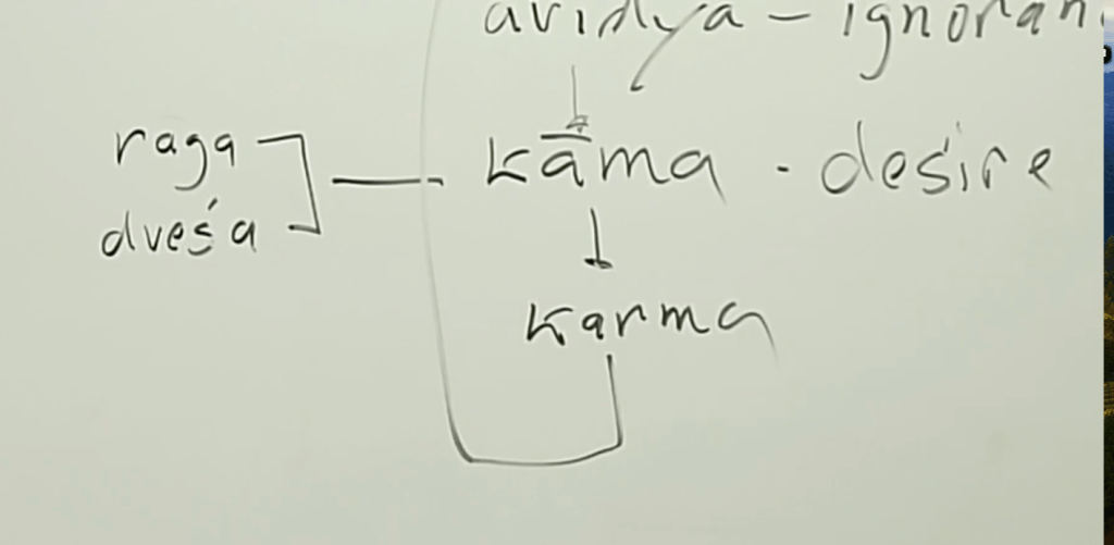 So here is the basic pattern and it shows the basic pattern of being stuck in a life of worldly suffering and being born again and again. Notice the centrality of kama, Raga and Dvesha. It’s in the middle of the problem.