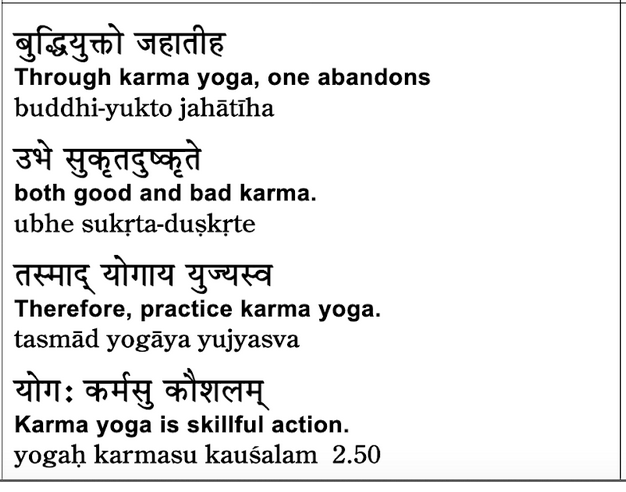 So very important — we talked about this in a prior class — karma yoga is not what you do. If what you do is help people, helping people is not necessarily karma yoga. So someone who helps people for the sake of personal gain, they want to be famous, or they want to feel good about themselves, or they’re paid very well for helping people… You get the point. Helping people is not karma yoga. Karma yoga is not what you do. Karma yoga is the attitude with which you carry out your daily activities.