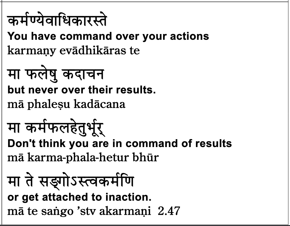 So, we just saw in verse 47 that we saw at length with the whole of the last class — was spent discussing verse 47, very important verse — and it gives us two crucial attitudes, two of many crucial aspects of the set of attitudes that form karma yoga. One of which is, if you have no control over the results, if you have control over your actions, if you have no control over the results, you start to realize the limits of what you can accomplish in life. You start to realize that you are not the master of your life.