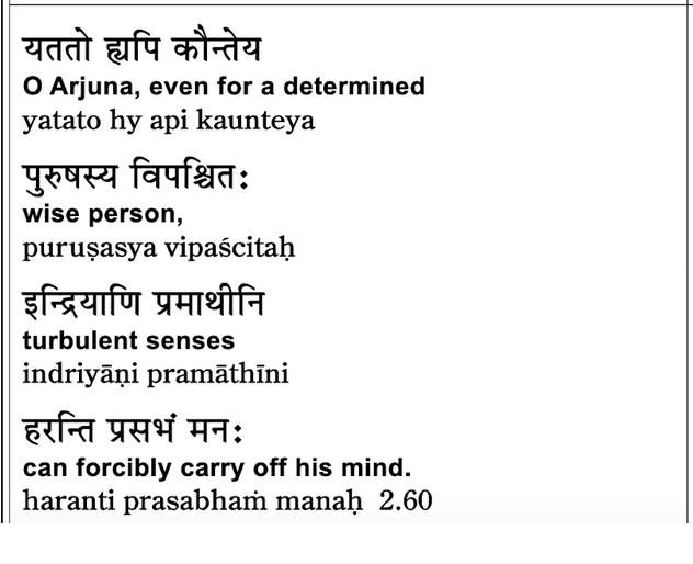 First line. Let me see that. He, he, he, he, hy—even, even for an enlightened person. Kaunteya, O Arjuna, O Son of kunti—even for an enlightened person. Yatataha, even for an enlightened person who strives, an enlightened person who strives—and the context is withdrawal. Going back to our tortoise metaphor: an enlightened person who strives to turn one’s attention away from worldly pleasures and to turn one’s attention within towards the true source of contentment and peace.