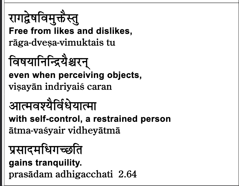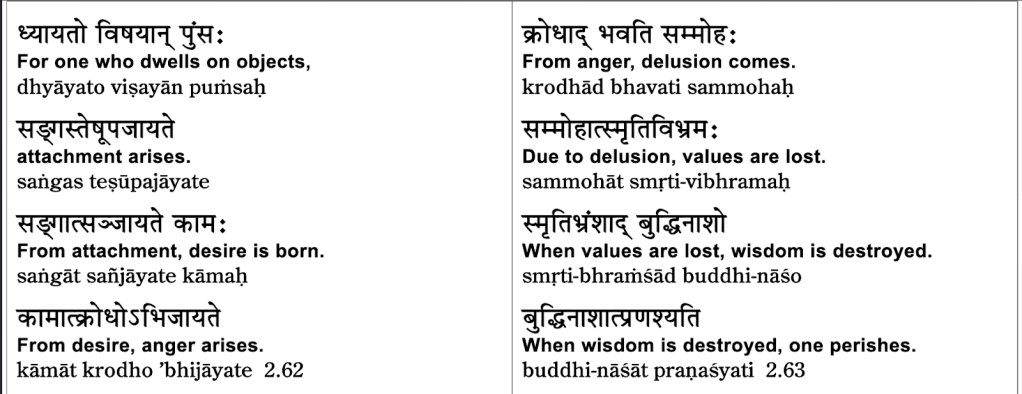 So these two are the hijackers: Raga and Dvesha, which literally rob away your mind. Hijack your mind. And the process of hijacking is described here in great detail. It’s actually a bit of psychology. There’s a surprising amount of psychology in the Bhagavad Gita.