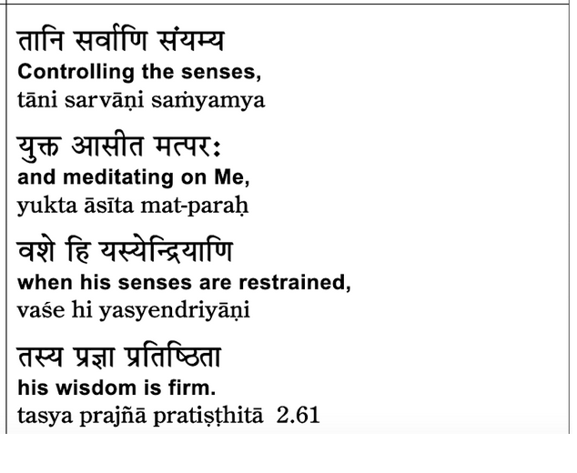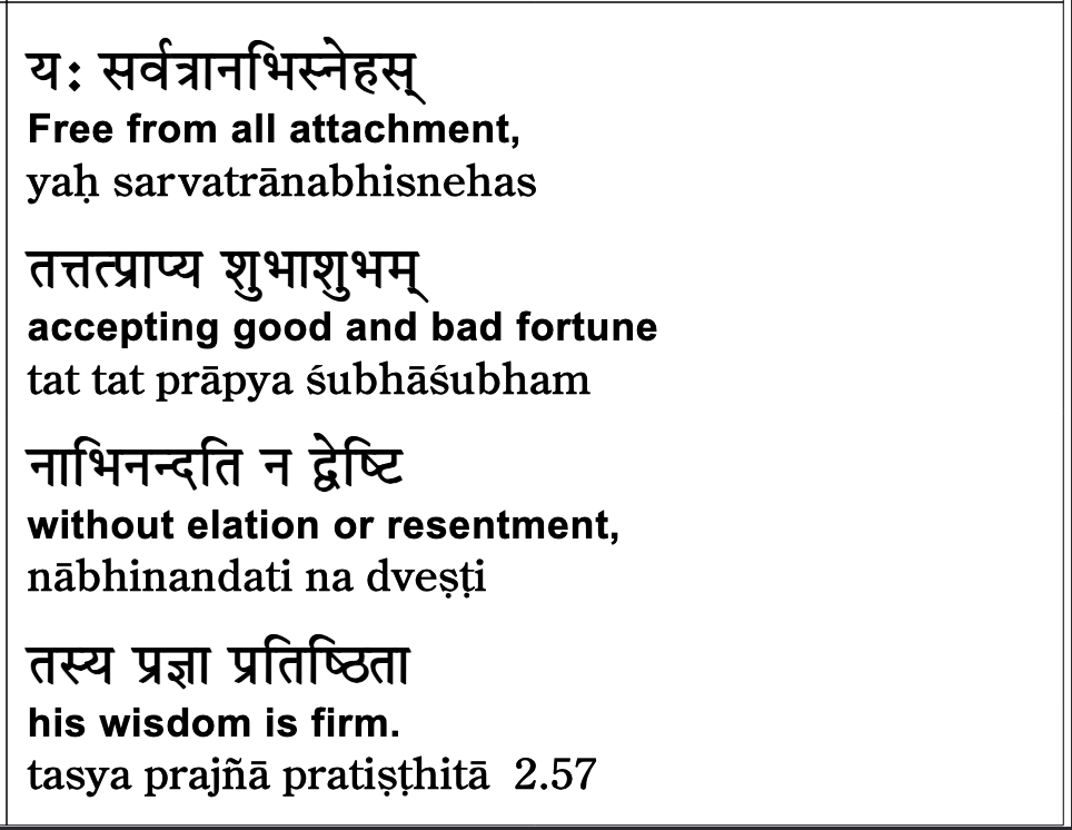 Some 58 I want to show you. Our context here, of course, is called the Stithapragya Lakshana, the part of the second chapter which contains the Lakshana, the characteristics of the Stitta Pragya. One whose Pragya, spiritual wisdom, is stitta, firm. Sri Krishna’s teachings here come in response to Arjuna’s question: How does an enlightened person sit and walk and talk and so forth?