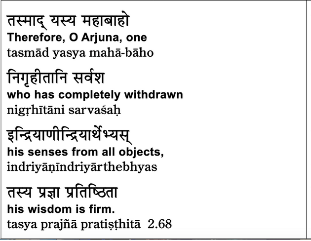 which was the last verse we saw in our prior class, where Sri Krishna concludes: tasmāt—therefore—mahābāho, we’ve seen this verse already, O mighty-armed Arjuna, yasya, one for whom (and go down to the third line) indriyāṇi, one whose indriyas, senses—and senses, remember, includes the mind. So not just sight, hearing, taste, smell, and touch, but including the mind—one whose senses are nigṛhītāni, restrained, sarvaśaḥ, completely restrained, indriyārthebhyaḥ, restrained from all sense objects. Tasya prajñā pratiṣṭhitā—for that person, that person’s wisdom is firm.