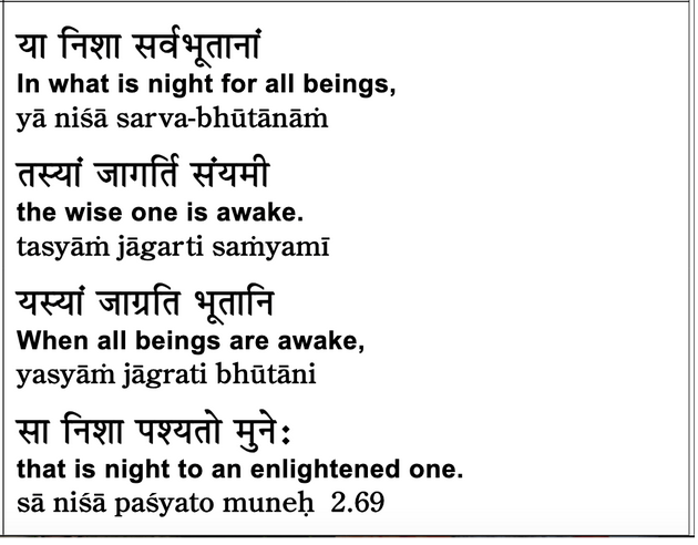 So the first half of the verse says that that which is night for unenlightened beings, in that state enlightened beings are awake. And yasyām, in the third line, yasyām jāgrati bhūtāni—in which state all unenlightened beings are awake—sā niśā paśyataḥ muneḥ—that is night for a wise sage.