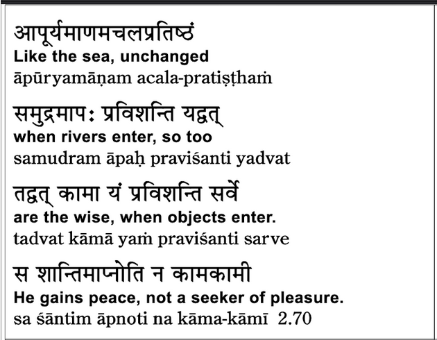 And that’s what Sri Krishna is referring to here. So all the waters of all the rivers can flood into the ocean—the ocean doesn’t rise. And all the pleasures in the world can be enjoyed by the enlightened person—any enlightened person—will not be enhanced in any way by those pleasures.