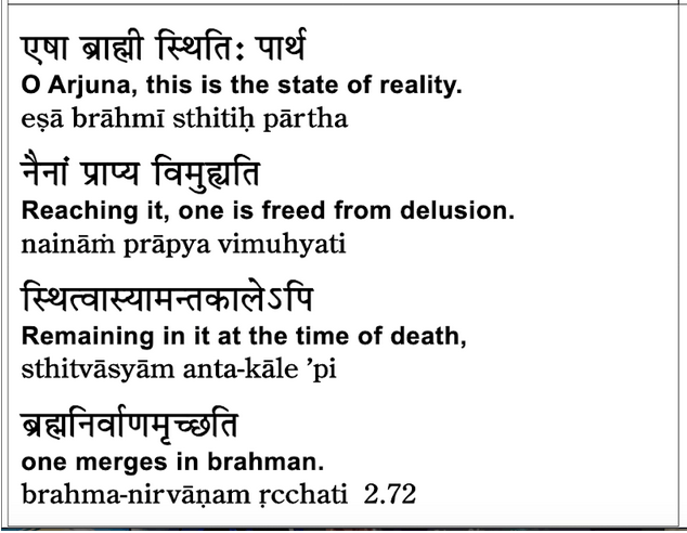 And a nice way to conclude our study of chapter two would be to return to my English translation. We’ve seen this a couple of times already. This English translation, you remember, I composed it following the meter of the original Sanskrit. And we will recite it.