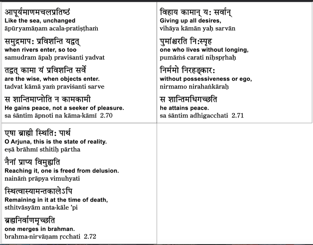 And the last topic, which began with Arjuna’s question back in verse 54—Arjuna asked, what is the nature of the sthita-prajña, one whose wisdom is firm? How does he walk and talk? It was Arjuna’s somewhat misguided question. And then we’ve seen a rather elaborate description about the nature of an enlightened person, sthita-prajña.