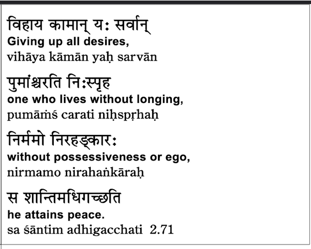 And using that word caretaker, Pujya Swamiji was trying to shift everyone’s orientation away from that possessiveness and emotional dependence. If you are just the caretaker, you don’t have that sense of possession. Mama here means that sense of possession. So nir-mama—the person is free from possessiveness.Your children are not you procession and nor is your home. Many of you have a mortgage so it is owned by your bank, but even when your mortgage is paid off, what does it mean to say my home that processiveness is a problem and if it is my home and it burns down you have a problem, if it was a caretaker for your home and it burns down then you wont suffer in the same way. nir-mama—the person is free from possessivenes Nir-ahaṅkāra—and free from pride. I guess pride goes along with possession: my children, my profession, my car. So that pride that comes along with your possessions.So that enlightened person who becomes freed, that enlightened person who—paraphrase the first three lines: the enlightened person who outgrows all desires, goes on living free from attachment, free from possessiveness, free from pride of ownership.